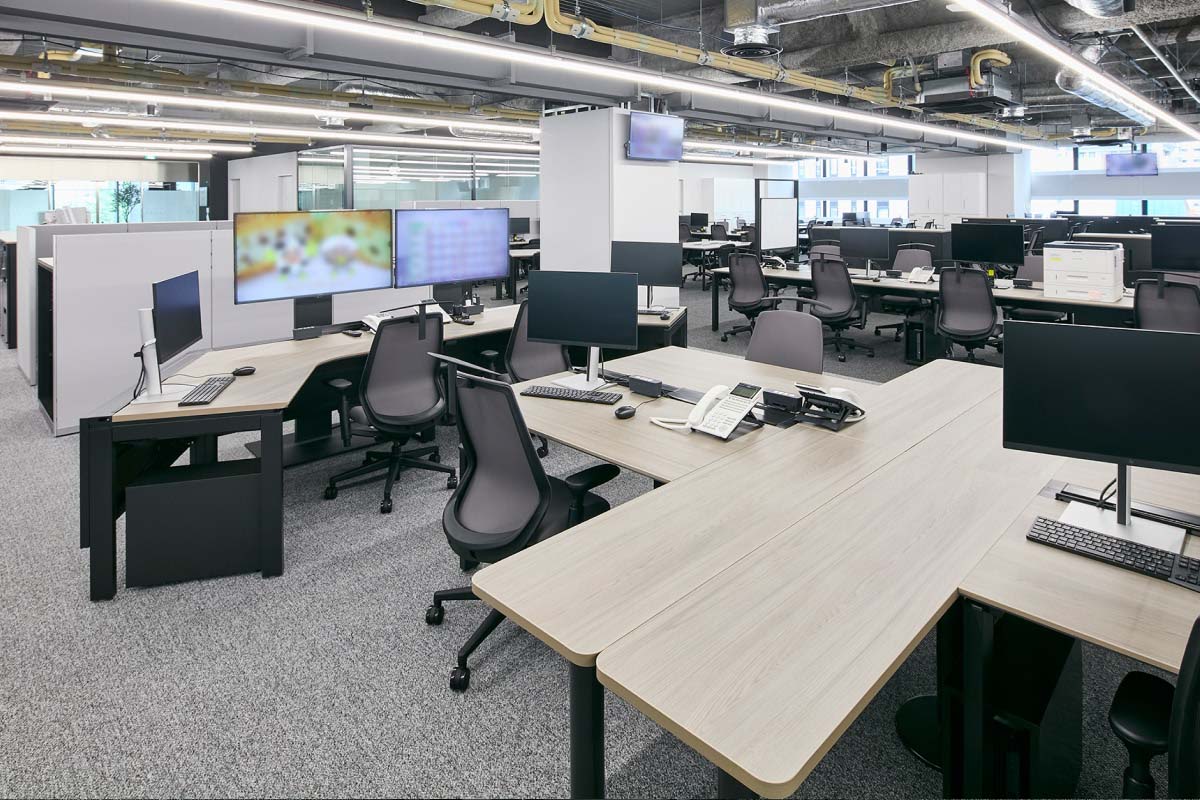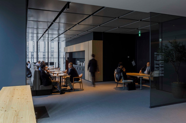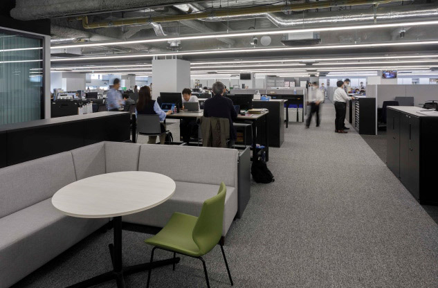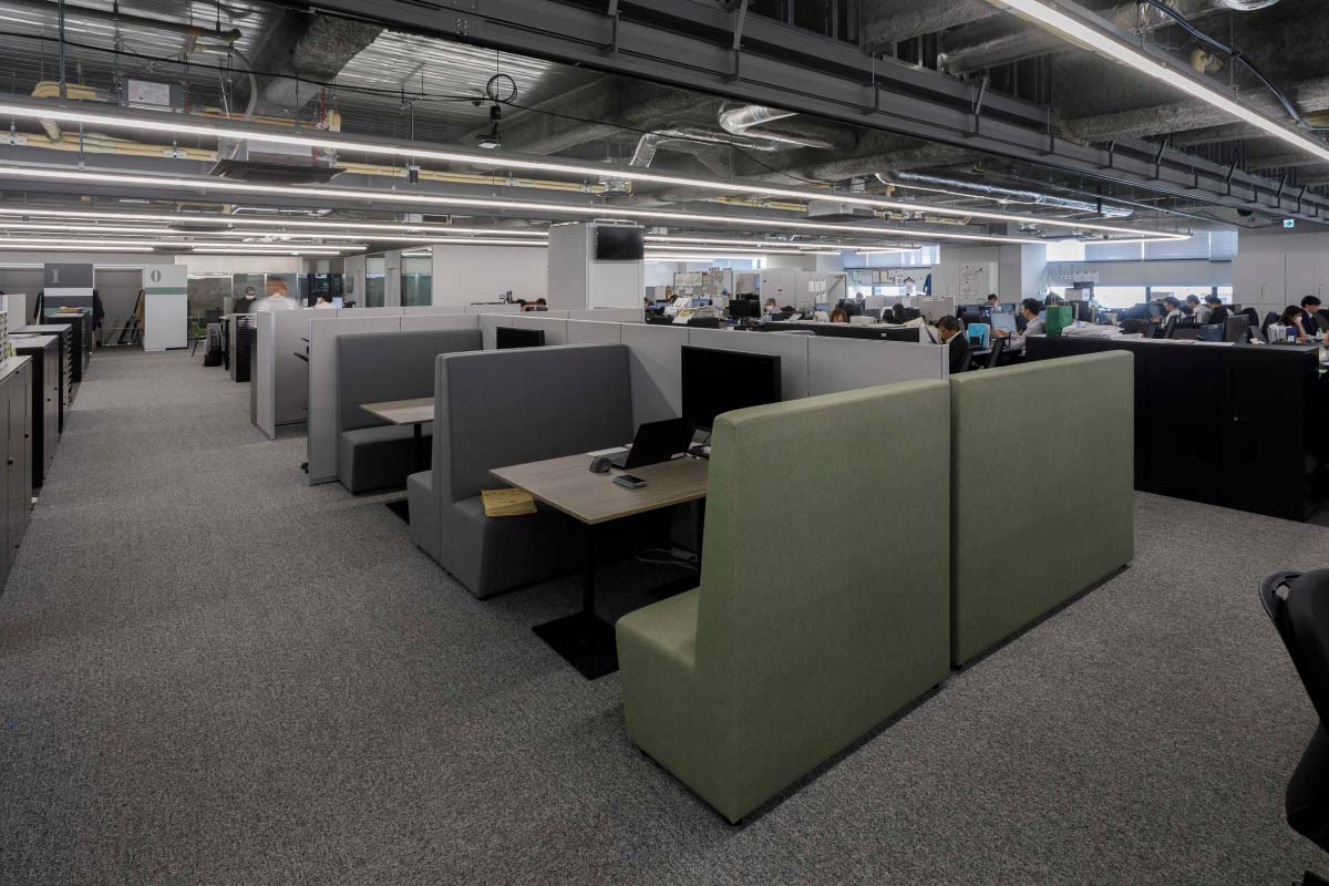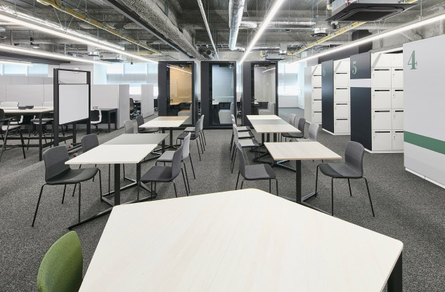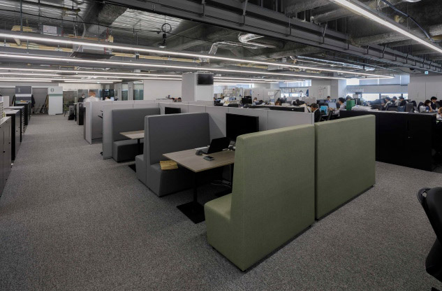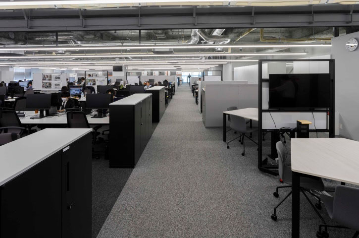 8階建のビルで本社オフィスが占めるのは4フロア。そのうちの3フロアが執務エリアです。壁や間仕切りの少ない大部屋は、将来的な可変性と維持管理のしやすさを目的にグリッドプランを原則としてゾーニング。席数や機能スペースをグリッドに変換してプログラミングすることで、適正な面積配分を行いました。
