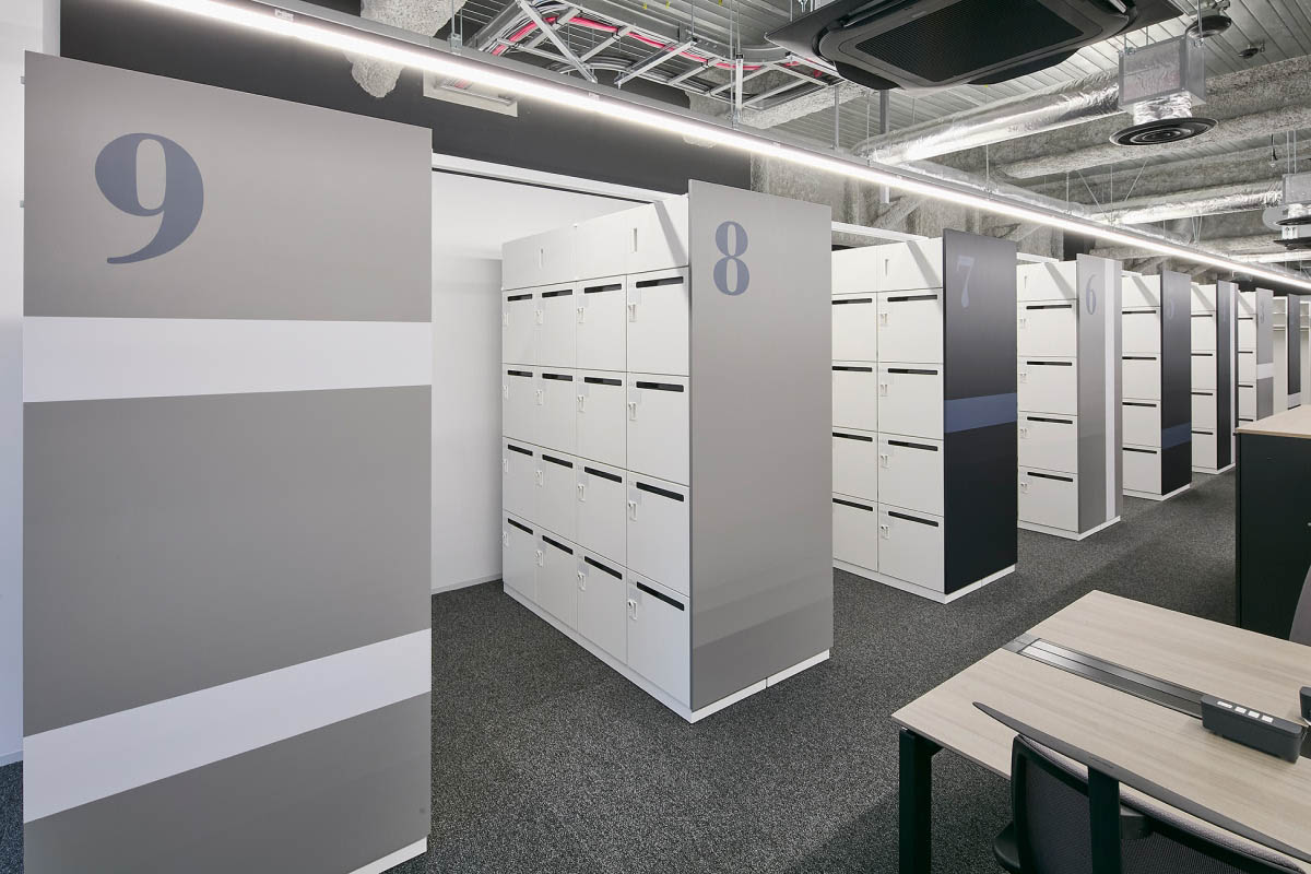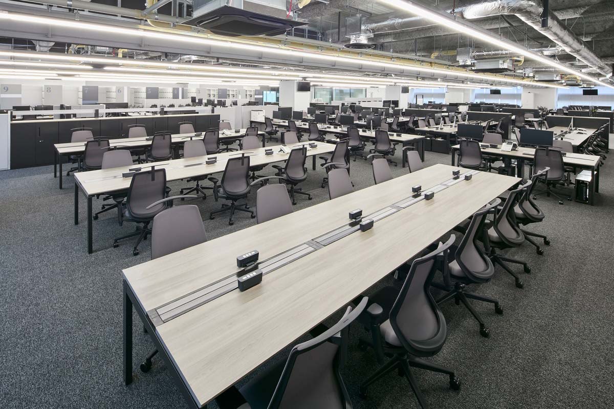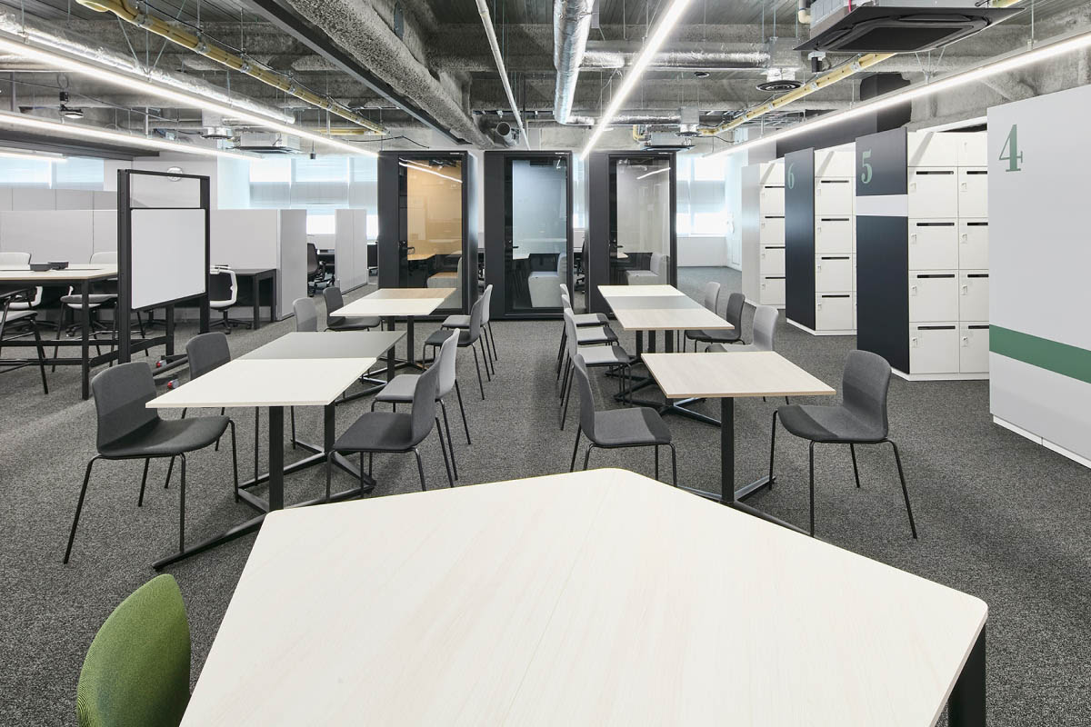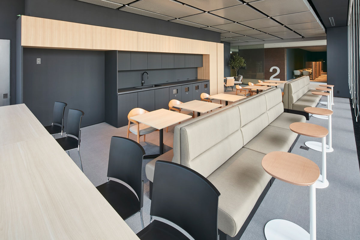 8階建のビルで本社オフィスが占めるのは4フロア。そのうちの3フロアが執務エリアです。壁や間仕切りの少ない大部屋は、将来的な可変性と維持管理のしやすさを目的にグリッドプランを原則としてゾーニング。席数や機能スペースをグリッドに変換してプログラミングすることで、適正な面積配分を行いました。