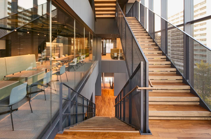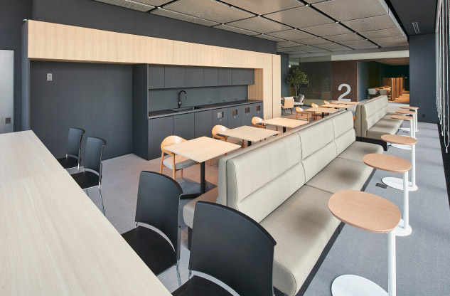 執務エリアを抜ける「boulevarD」が行き当たるのは、「3Cs(スリーシーズ)」のコンセプトから生まれた「3C Zone」。ここは、食事やリフレッシュ、打ち合わせ、急な来客対応など多用途に利用できるエリアで、落ち着いて仕事ができるソロワーク席も多数揃えています。フロアごとに、色合いが異なる「3C Zone」は内部階段で行き来が可能。現在は別拠点で勤務されている神力千尋様は「ガラス越しに外が見える気持ちよさもあってか、他の拠点よりも階段を使う人が多い」と感じるそう。上下階のコミュニケーションだけでなく、健康増進にも一役買っています。活発に行き来されている姿は、街の方々にも頼もしく映っているのではないでしょうか。