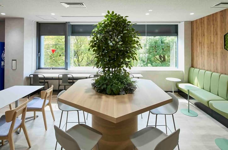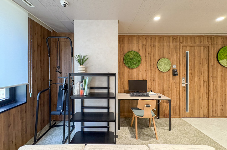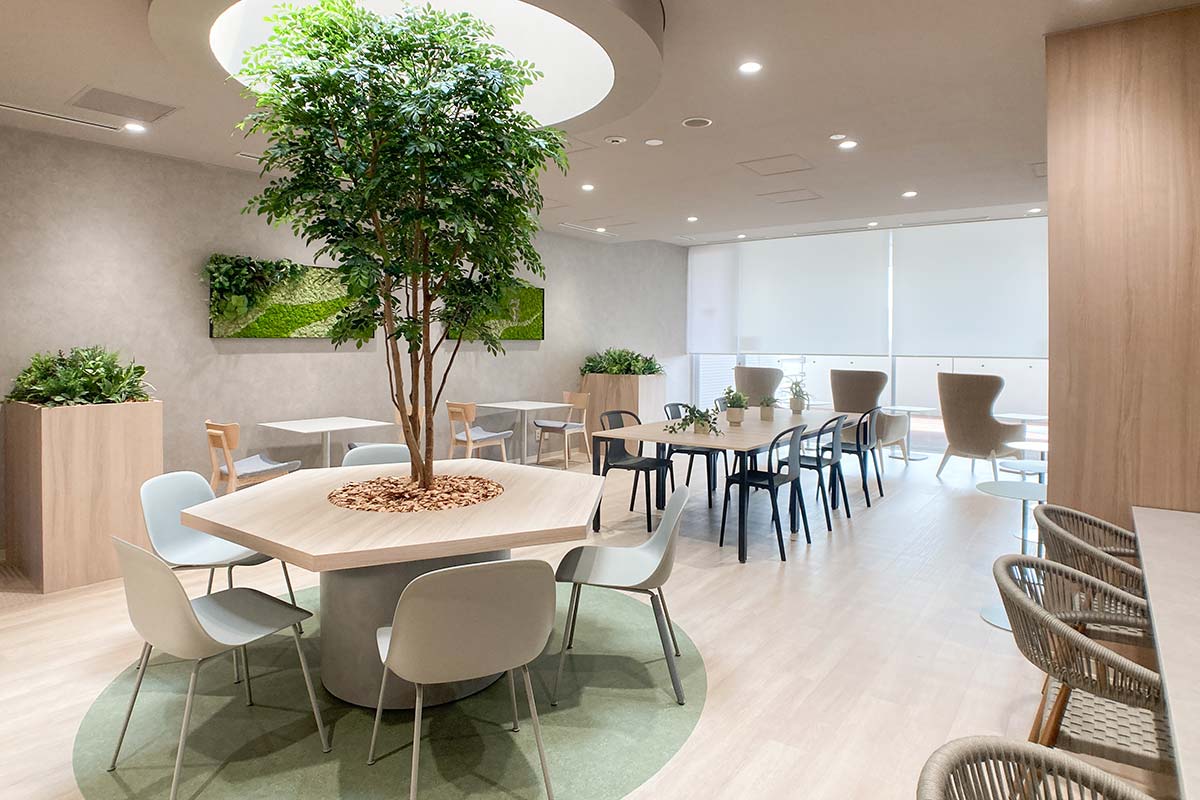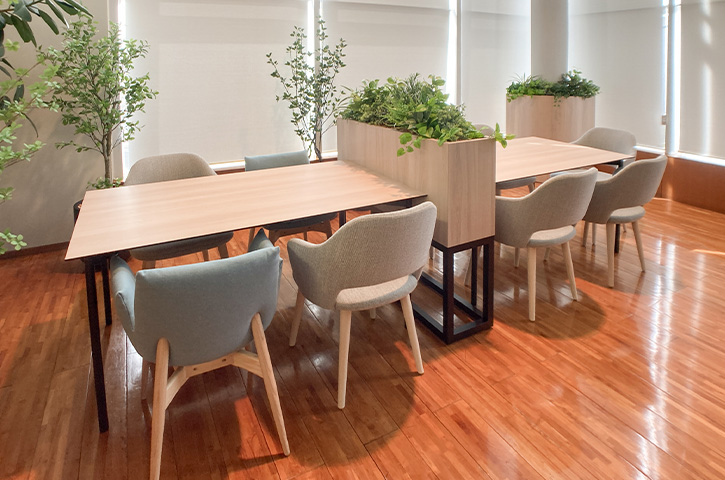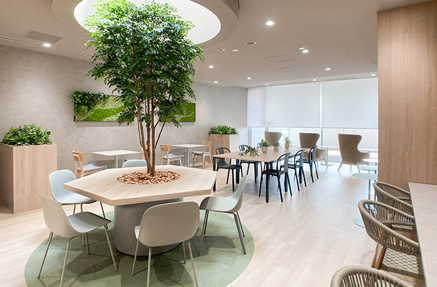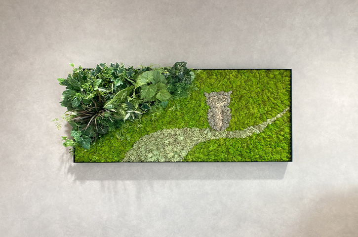 「さまざまな提案をいただきましたが、印象深かったのがモス(苔)を使った壁面ディスプレイです。各本部に、デザインの異なるフクロウ(社章のモチーフ)が飾られていることで、統一感と個性が共存したように思います」と中山様。他拠点から訪問した際に話の糸口になって、コミュニケーションの円滑化にも一役買っているそうです。
