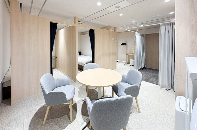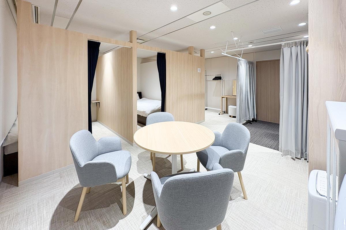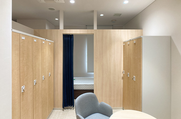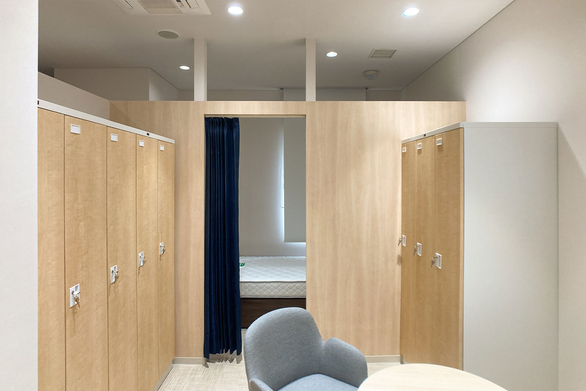 当初は、女性活用の推進で始まったプロジェクトでしたが、実際、総務部 管財グループのご担当者様と一緒に、各本部を訪問させていただいたことで、男性の待機室に対する要望、たとえばパイプベッドの軋む音が気になる、いびきがうるさくてよく眠れないといった不満も浮き彫りに。それを受けて、耐久性や耐荷重性の高い木製の二段ベッドやカプセルを導入し、男性もゆっくり休息できる環境を整えました。