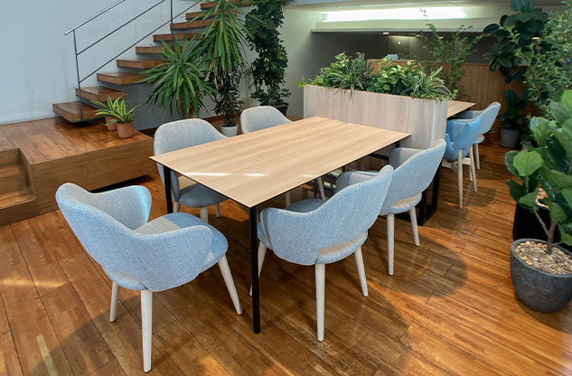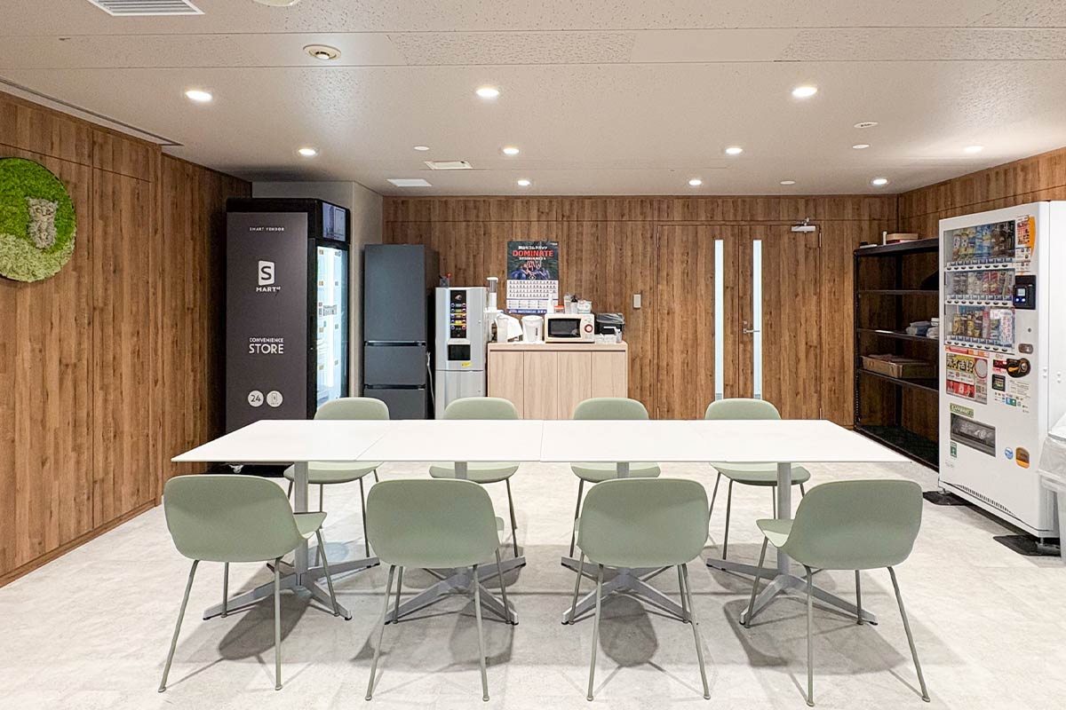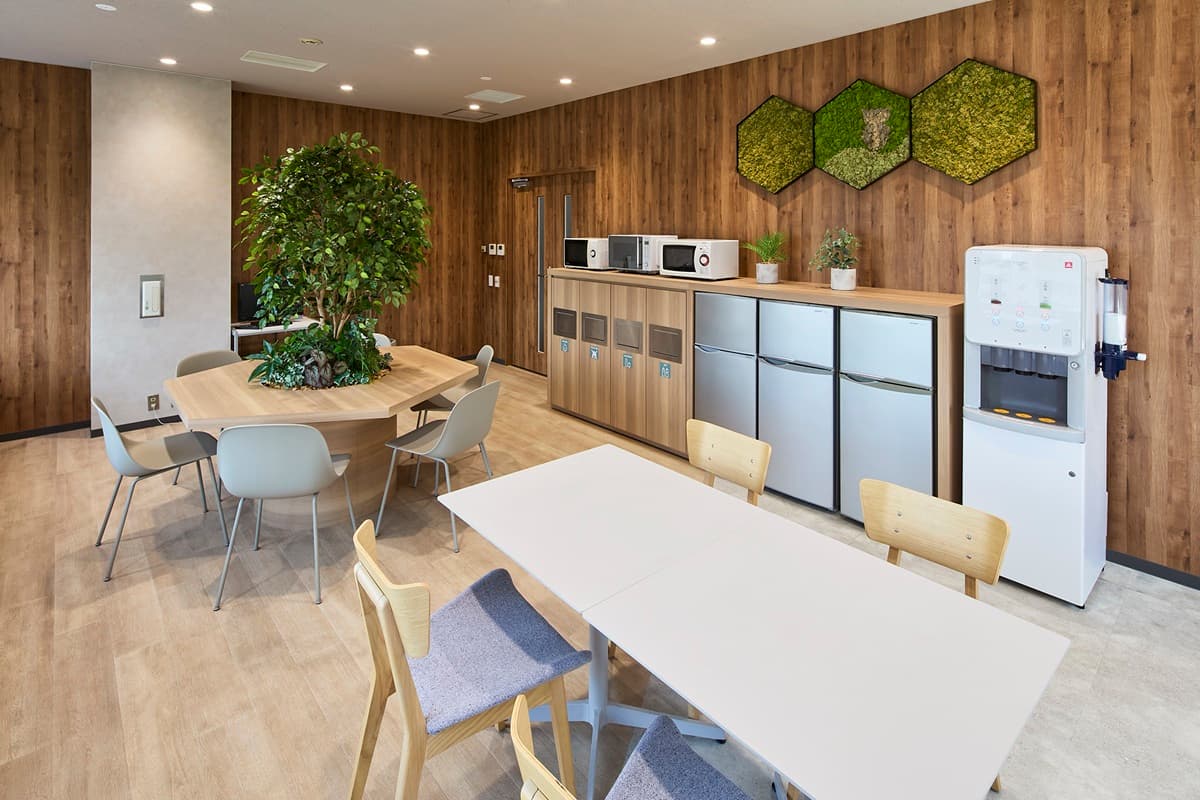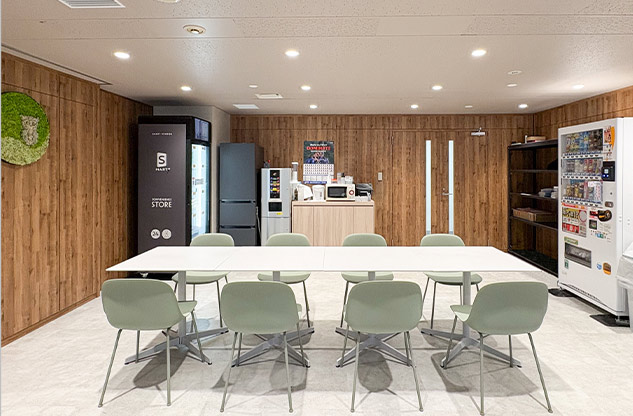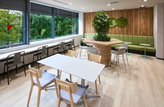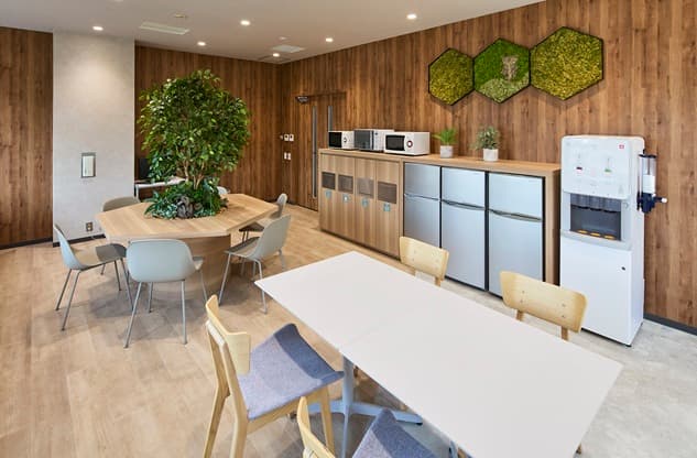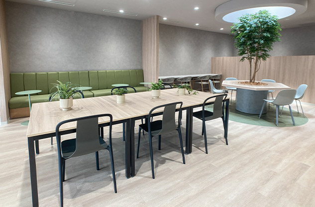 質の高い休憩を取っていただくために、内装は自然が感じられる木質調に。グリーンも積極的に取り入れました。その上でラウンジには、窓や壁に面して1人でゆっくり過ごすことができるソロ席や、隣あったメンバーとの会話で気分転換ができるソファ席やテーブル席など、気分や状況で選択できる居場所をご用意。冷蔵庫、レンジ、自販機など食事やドリンクブレイクを取るための設備も導入しています。また、人の24時間周期の体内リズムに合わせて、太陽光のように光の色温度や明るさを時間で変化させるサーカディアン照明も採用。限られた範囲の中、しっかり休憩をしてメリハリをつけて就業していただくための設備を盛り込みました。