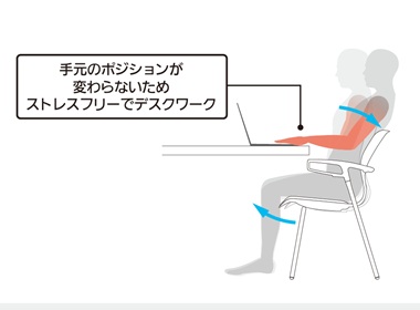 姿勢の変化に合わせたスムーズなリクライニングは、執務作業と思考やリラックスなどの活動との切り替えを自然に行うことができ、身体を能動的に動かすことによる健康促進もサポートします。