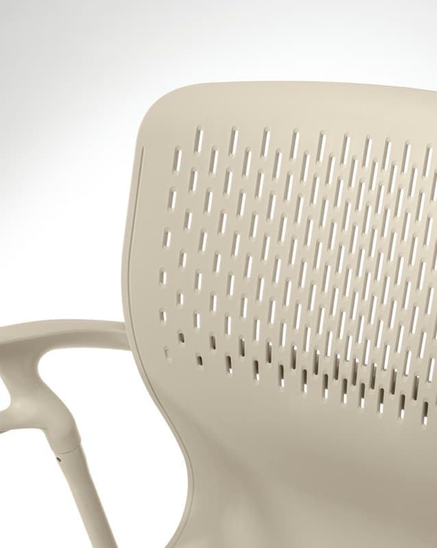 背と座がつながったシェル構造となっているため、背を倒す力に連動して座が前方に押し上げられ、振り子に似た軌道を描くように動きます。変形したシェルが元に戻ろうとする力によって、楽に姿勢を戻すことができます。