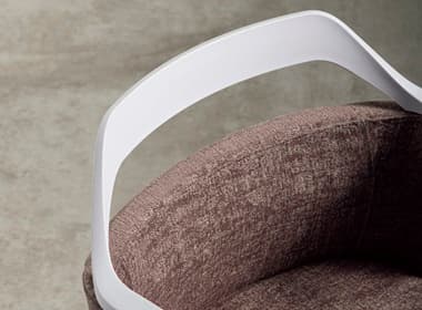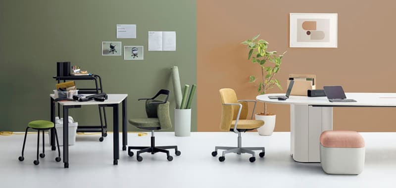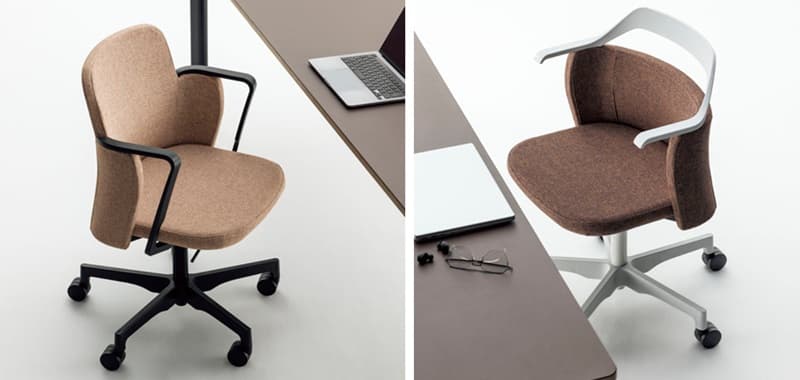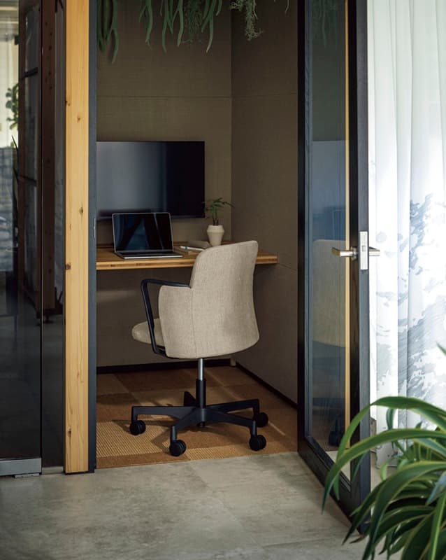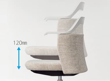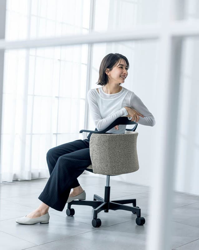 優しいクッションのミドルバック背と座下まで伸びるアームレストが特長のNestタイプと、腰までの高さに抑えたバックシェルに、アームレストと滑らかにつながるバックフレームがユニークなシルエットとなったAirタイプ。個性的などちらのタイプも、背もたれのシェル袖が腰部に寄り添うよう包み込み、パブリックなオフィスシーンでも安心感のあるプライベートな空間を感じさせてくれます。