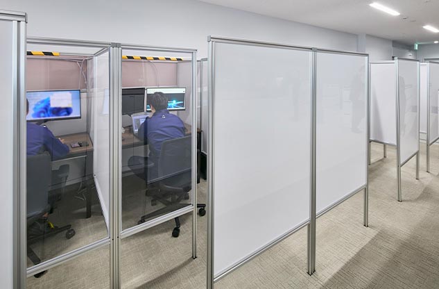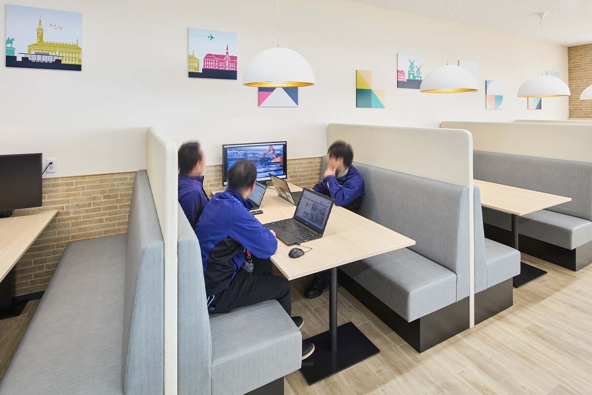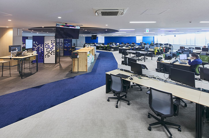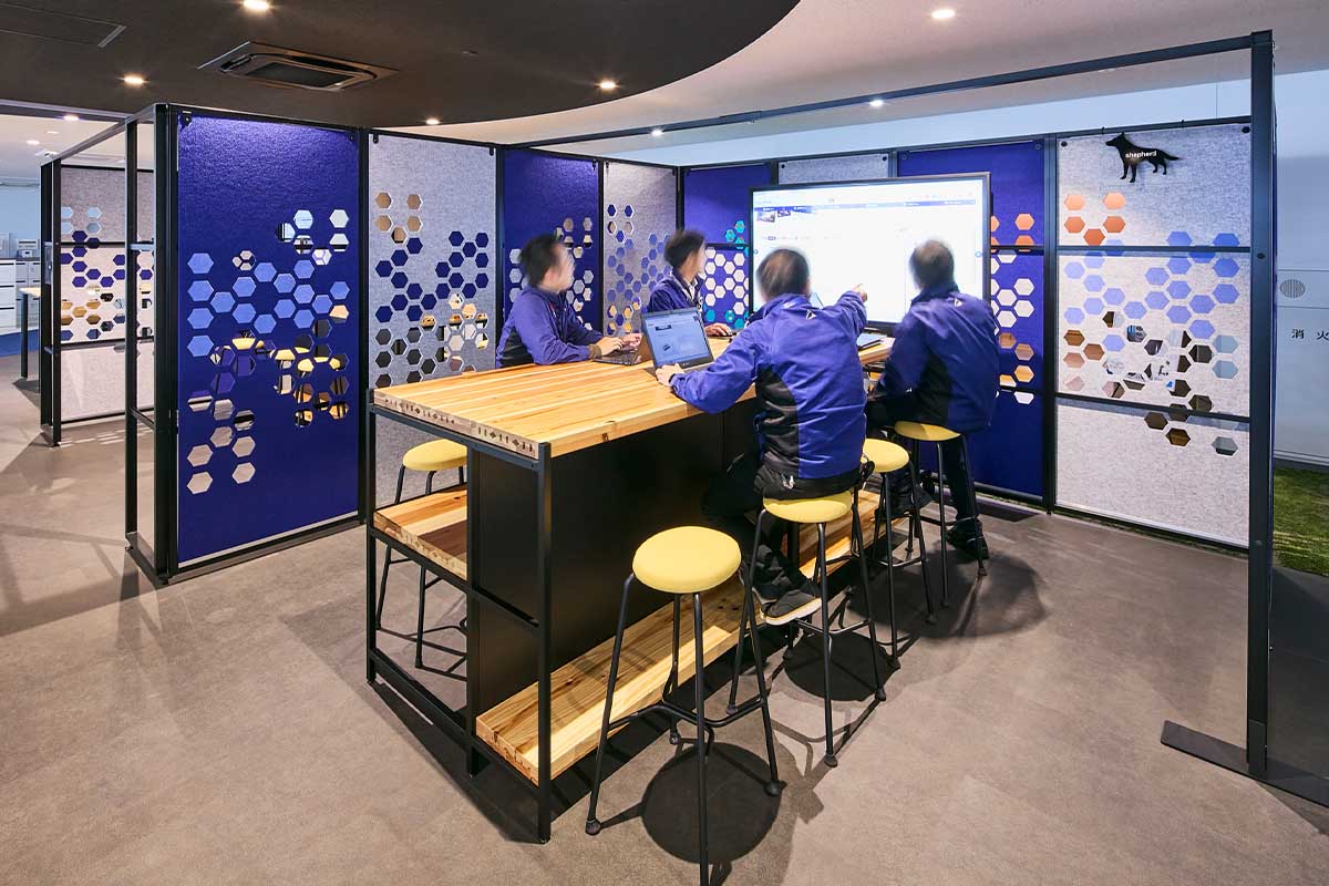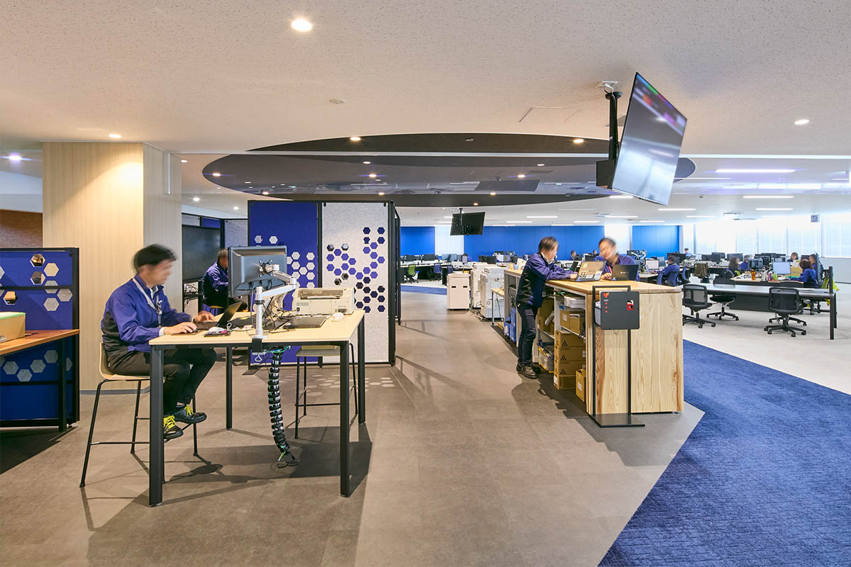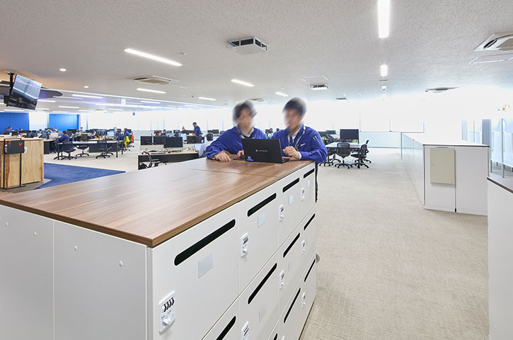 その後、コロナの感染拡大で建設が延期になりましたがワーキンググループはその間に詳細を詰め、精度をさらにアップ。緊急事態宣言を受けて在宅勤務やオンラインミーティングが一般的になったことが、当初から目指していたフリーアドレスによるABWの働き方へシフトする後押しにもなりました。「各島に固定電話が絶対に必要というのがフリーアドレス化を阻む最大かつ最後までのネックでしたが、teams導入で各自が電話番号を持つようになったことから自然にクリアになりました」(壁谷様)。