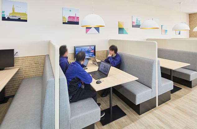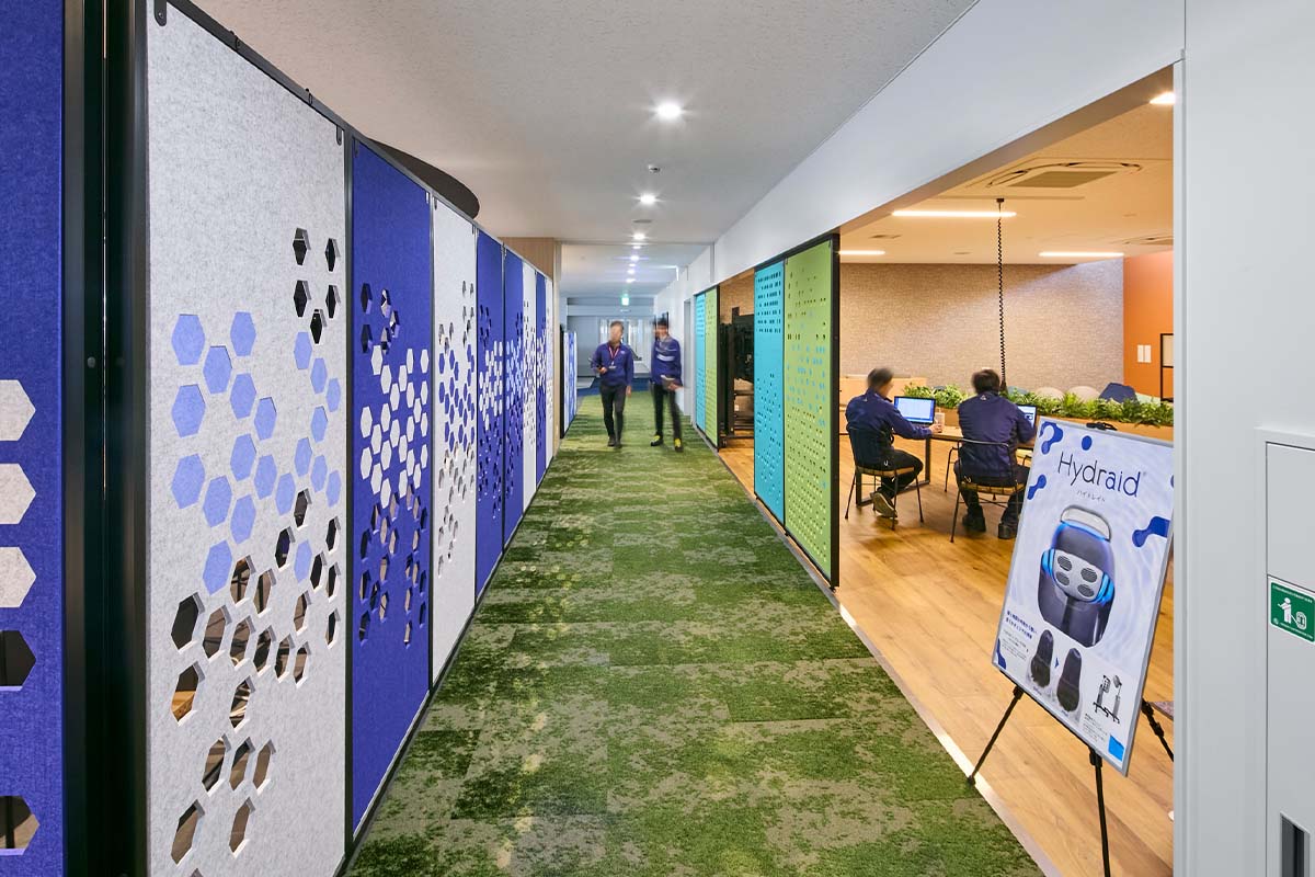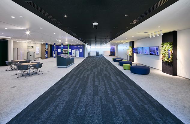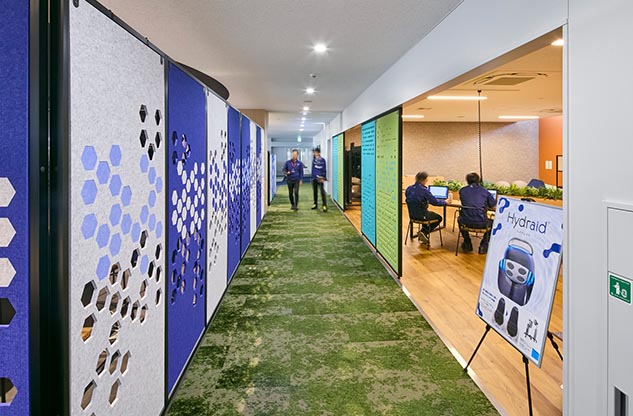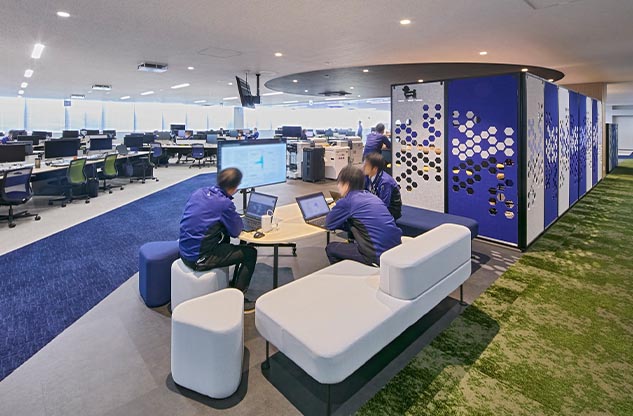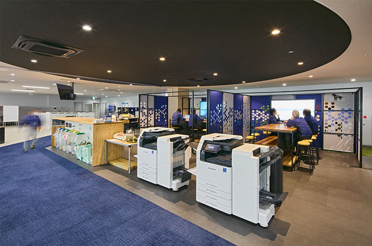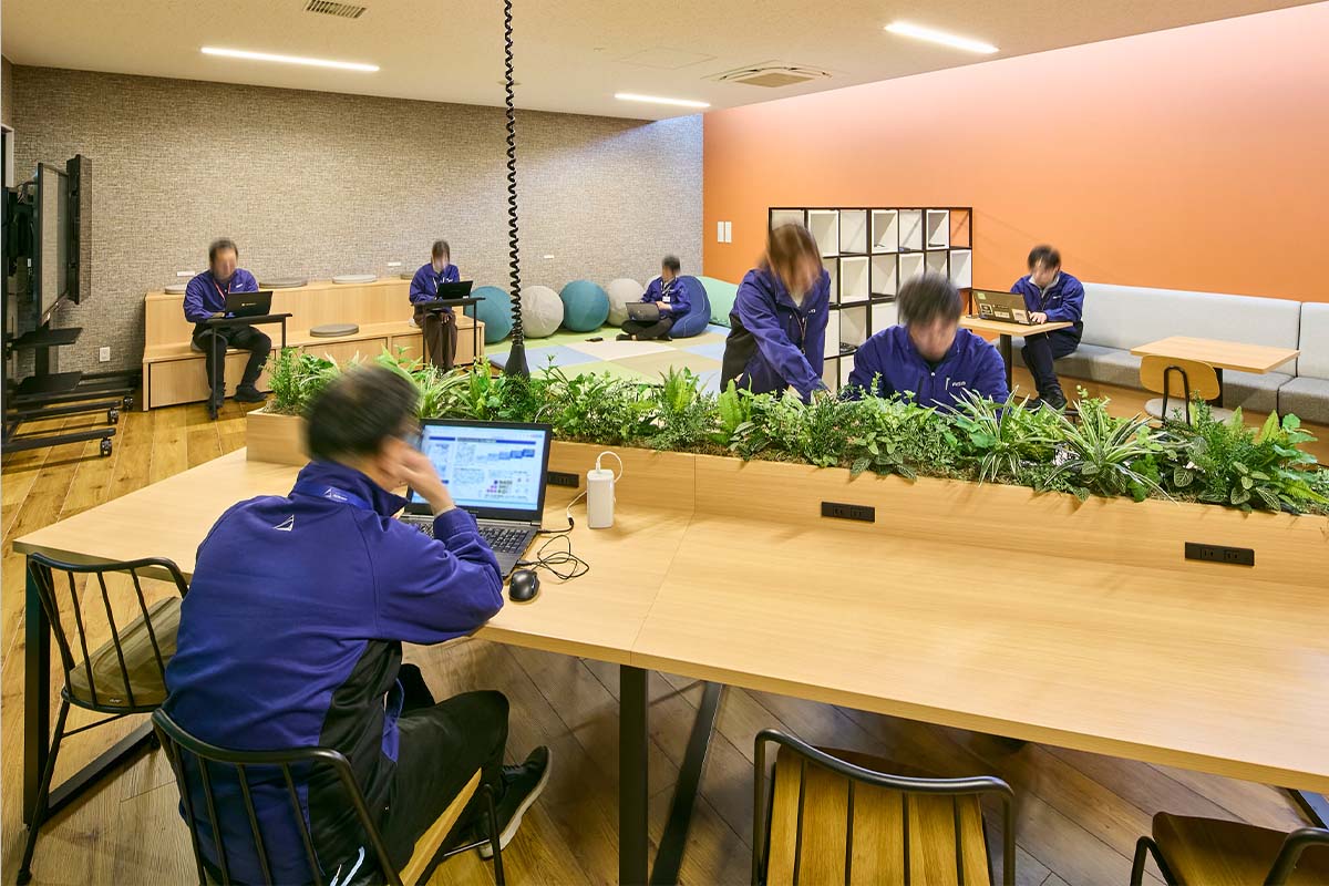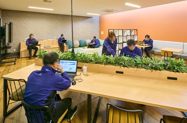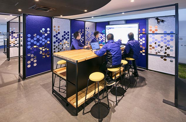 プロジェクトの再開後、オフィス構築のパートナーに選んでいただいた内田洋行は、ワーキンググループの皆様がつくり上げた新オフィスのイメージの具現化に努めました。オフィスの中央エリアに複合機などを集約した、人が自然に集まるマグネットスポットを設け、それに面してミーティングスペースを設置。フリーアドレスを実現した執務室のデスクエリアは、ふとした時に視線が合いやすいように、デスクを縦横交互に配置したうえで、要所にすぐに集まって打ち合わせができるミーティングスペースも確保しました。さらに、気分を変えてワークやミーティングができるリラックスエリアも構築。こうして、コミュニケーションの活性化をすすめる一方で、壁面に沿ってアイシン様内製の集中ブースを設置して没頭できる場を設けるなど、業務に合わせて場所を選ぶことで生産性を向上できるオフィスを実現しました。