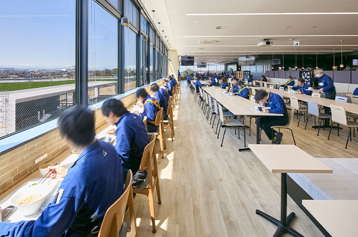 建屋は3層で、1階に生産ライン、2階はロッカー、休憩室など、3階にショールームとオフィス、食堂を集結した配置です。内田洋行はオフィスと食堂の空間設計および什器、ICTの提案・調達を担当。ワーキンググループの皆様の思いを具現化するために、しっかり伴走させていただきました。