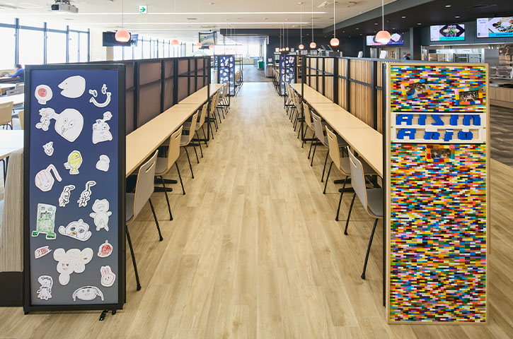 インテリアは、北欧的な設えで「日本のデンマーク」と呼ばれる安城市らしさを表現。壁面にはデンマークの街並みや、安城七夕まつりをモチーフにした装飾も配しています。また、旧工場の解体時に開催したお絵描きイベントで子どもたちが描いた絵や、新工場お披露目会でつくったブロック玩具の作品も取り入れ、家族や地域とのつながり、過去と未来への流れも感じられる場になっています。