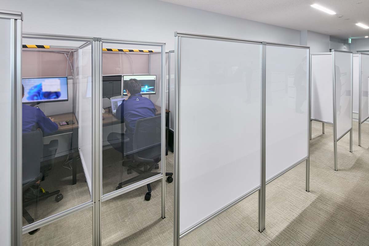 こうした検討の際に活用したのが、DX化を推進されているアイシン様の意向を受けての建設・建築用モデリング「BIM」です。内田洋行は工場の設計建築を行ったアイシン開発株式会社様と連携し、建物の図面にさまざまなモジュールを組み込んでPC上で3Dのシミュレーションを実施。執務室内の中央エリアとデスクエリアで照明の輝度を変えるといったアイデアをBIMでリアルに再現することで、そのイメージや効果を全員に共有しながら進めることができました。「リアルな3D化によって、この幅はもう少し広いほうがいいね、や、この什器がここにあると狭く感じるね、など、事前に検討できてすごくよかったです」と壁谷様。佐部利様も「BIMデータとVRの組み合わせで実際に歩いて見える景色が再現できたのでイメージが湧きましたし、上層部への説明時にも説得力が増しました」とBIM採用を評価されています。