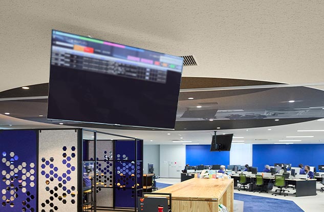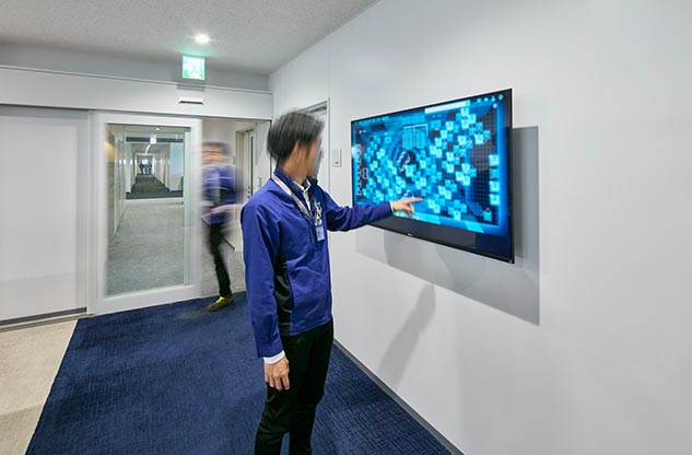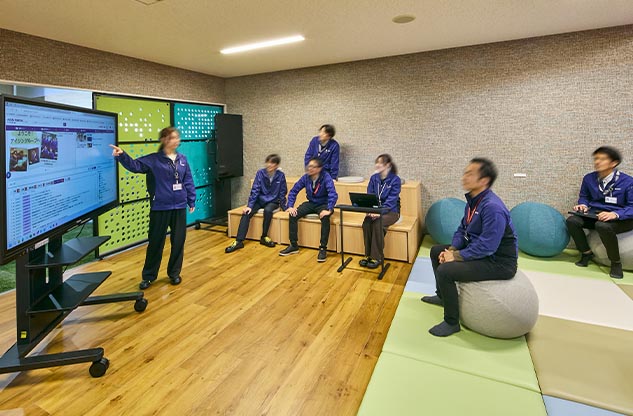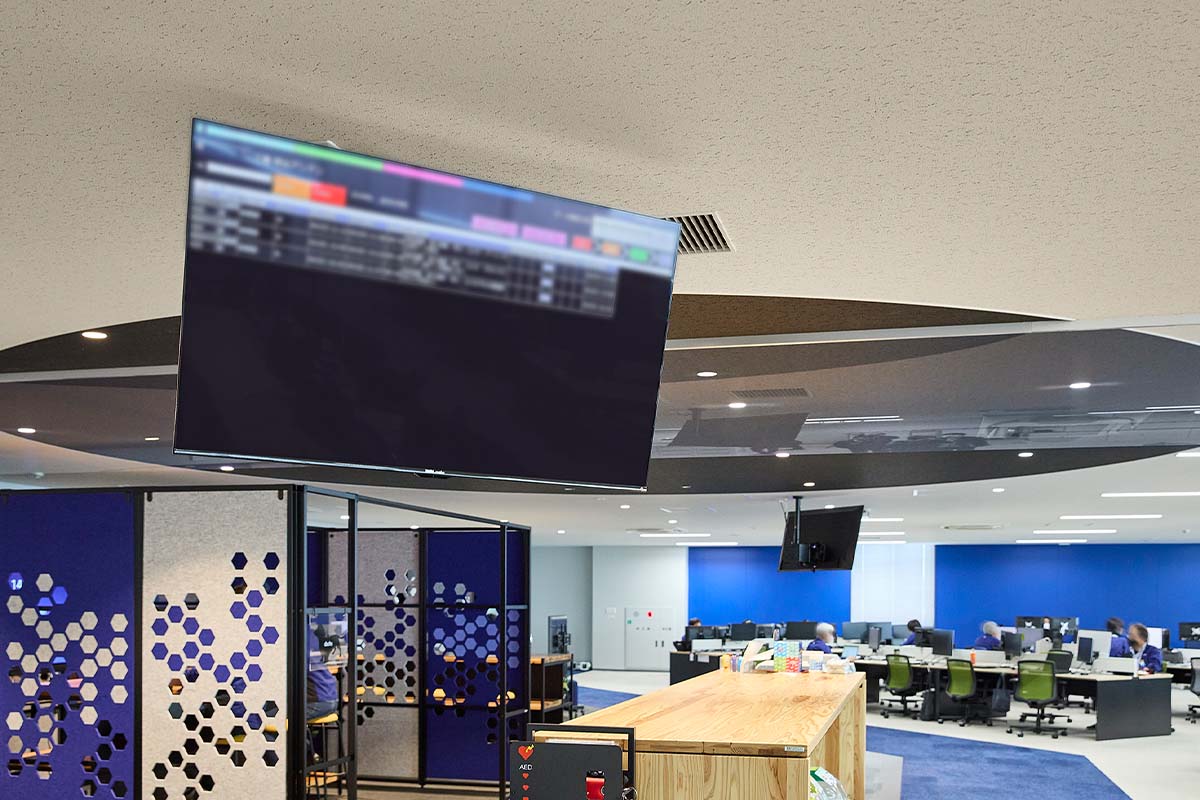 食堂は、昼食時以外は、ワークやミーティングにも使用されており、全体会議やイベント時の会場としても重宝しています。また、災害時には近隣住民の方も受け入れての防災拠点として活用することも見据えており、ベッドにもなる大きなベンチ席などに防災備蓄品を収納。平時にはテレビや社内情報の伝達に用いるサイネージで、最新の災害情報を入手することもできます。