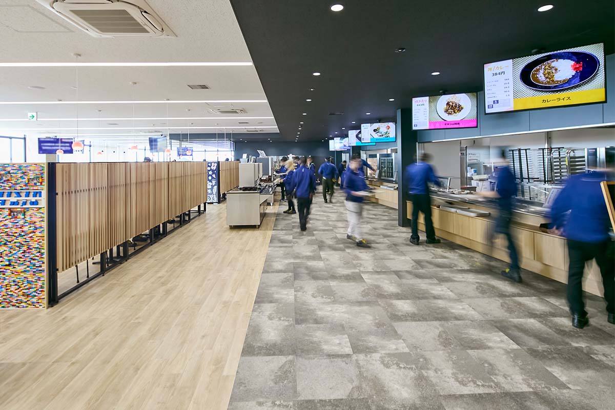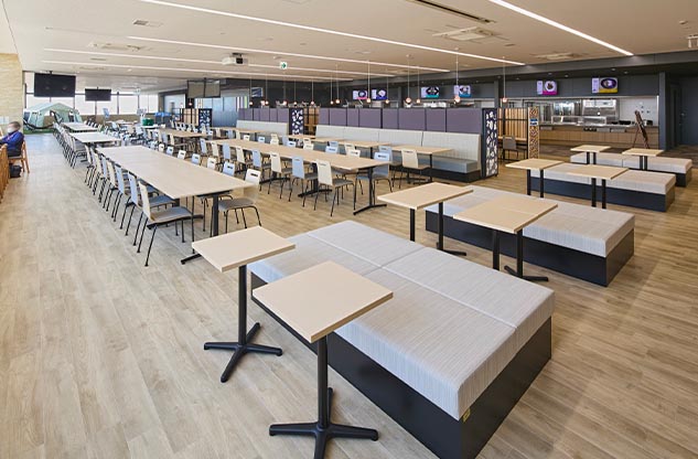 旧食堂の課題は、動線が混雑して、充実した休憩時間を提供できないことでした。これに対し、各配膳口を通路に対して斜めに設置し上部にサイネージでメニューを示すことで、入口からの視認性をアップ。さらに縦横のわかりやすい通路設計を行い、一方通行を推奨することによって、スムーズな配膳・下膳を可能にしました。また、ソロ、ペア、グループのそれぞれで、ゆっくり食事できる時、時間がない時というように人数や滞在時間に合わせて場所が選べるゾーニングを実施。外の景色を見ながら過ごせるハイカウンター席や互いの顔を見ながら食事や会話がしやすいテーブル席、囲われ感があって落ち着くファミレス席など、多様な席を用意して、思い思いのスタイルで充実した休憩時間が過ごせる場となっています。